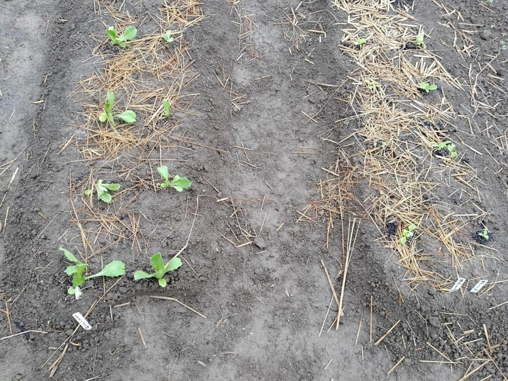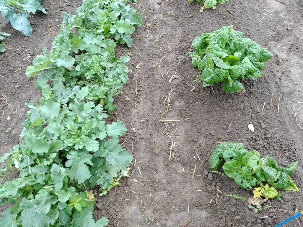 畑に移植(レタス類)           → ⑤ 移植後10日後の苗(ホワイトニンニク)    → ⑥植え付け⑤1ケ月収穫前の大根と花菜