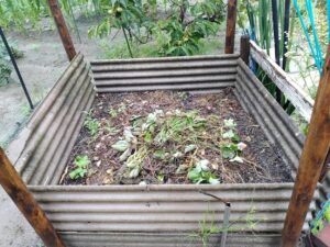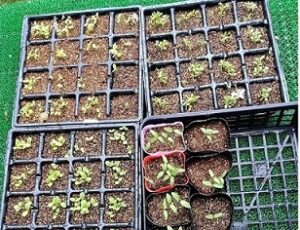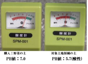 ①土壌の酸度計測(石灰でPH≒7に調整)→  ② 有機肥料,腐葉土(枯芝、枯葉に米ぬか混合)  → ③ ポットに野菜種を播種、約2週後